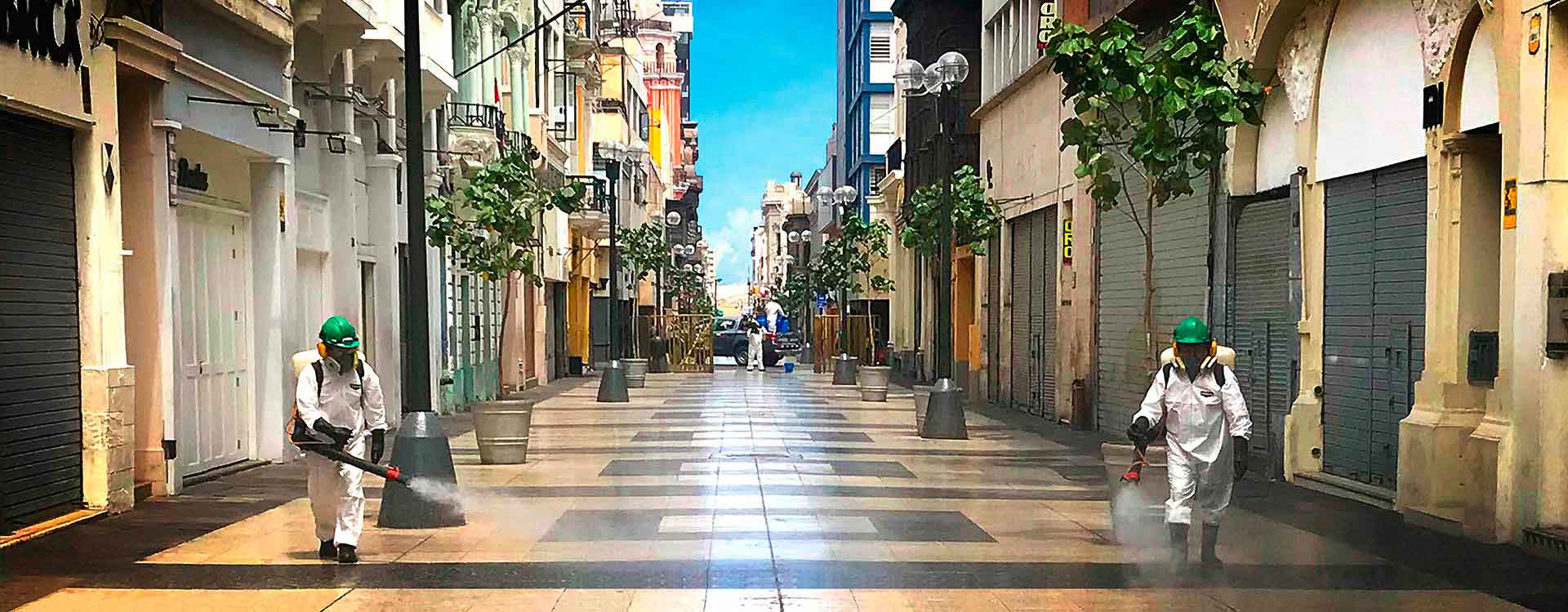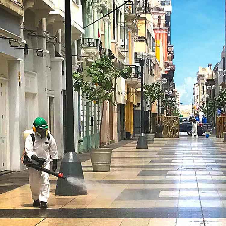 La desinfección de espacios públicos como ingresos a condominios, jardines, parques y otras áreas de tránsito de personas.